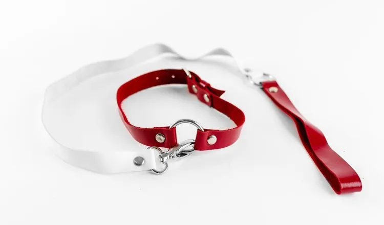 Beli i crveni čoker od prave kože sa povodcem