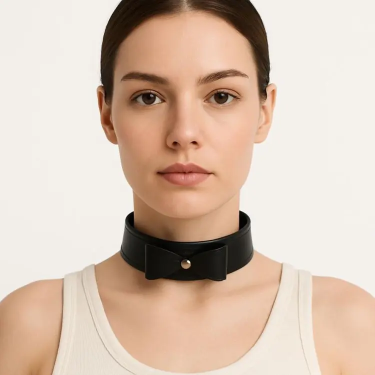 - Elegancija i stil: Ovaj crni kožni okovratnik sa mašnicom dodaje notu sofisticiranosti i šarma, savršen za posebne prilike ili svakodnevno nošenje.